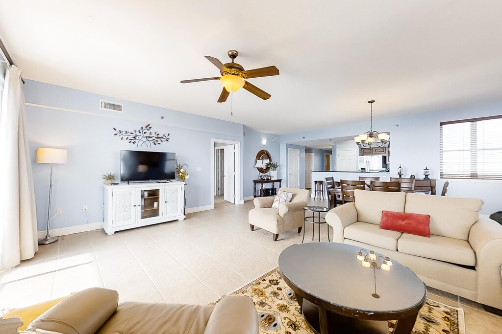 Experience the Sunshine State like never before at this 18th-floor condo! With a calming feel featuring both north and south private balconies, Ariel Dunes II 1801 is the choice to go when looking for relaxation, convenience, and elegance. The living area has lovely high-end furniture, nicely tiled floors, and an area rug. Enjoy a family movie night with a large flatscreen TV and DVD player, or listen to your favorite music before heading to the beach with the CD stereo system. Put on the chef’s apron and surprise your friends with savory meals prepared in the fully-equipped kitchen, which features upscale granite countertops, stainless steel appliances, cherry wood cabinets, and everything you need to cook a home-cooked meal. There is a formal dining table for six as well as four bar stools for casual dining at the bar. Then, grab your beach towel and sunbathe next to the shared outdoor pool before taking a refreshing dip.