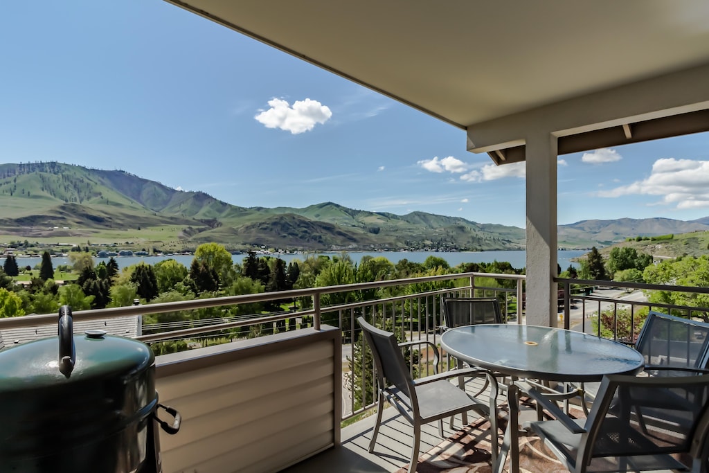 This cozy two-bedroom Chelan condo offers gorgeous views of mountain vistas and access a shared hot tub and pool as well as enough amenities to keep you occupied.