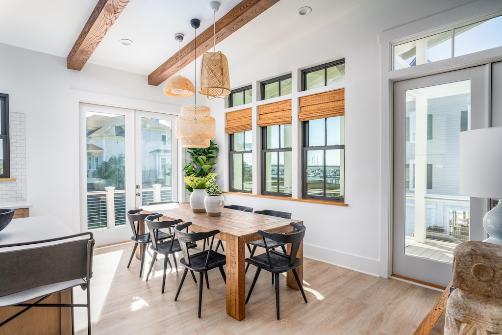 On the 1st floor, you will find the light-filled great room with vaulted ceiling and an open floor plan overlooking the water. The well-equipped, spacious and beautifully designed kitchen has top of the line appliances, quartz countertops, brass fixtures, and an island that seats 5. Adjacent to the kitchen, the dining area has seating for 8 and opens up to the expansive wrap-around porch, which includes both a screened section and an open/unscreened section with a grill. The screened porch area accommodates dining for 6 and also has an additional seating area with a sofa and twin rocking chairs. The uncovered deck section features a grill as well as lounge chairs for catching rays and a circular table with seating for four, perfect for mid-afternoon lunches al fresco. Designed with several inviting lounge areas, the porch is ideal for morning coffee, sunset hors d’ oeuvres, grilling, family dinners, and more.