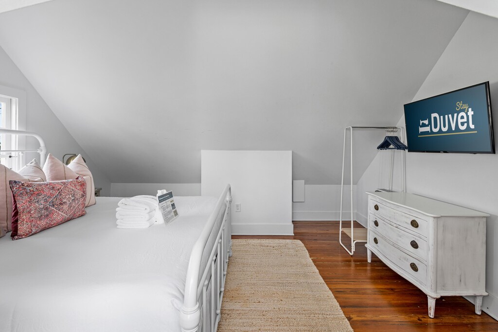 3rd-floor King bedroom features a spacious full bathroom just across the stairwell landing. Each of these King bedrooms with their own flat-screen Smart TV. Our team provides basic login credentials, so feel free to use your own during your stay.