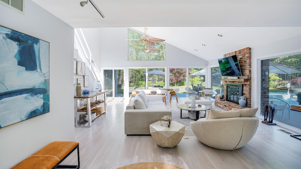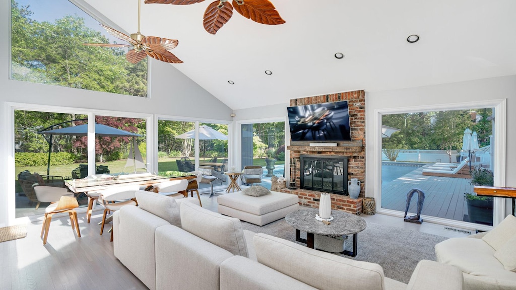 Experience contemporary luxury in East Quogue. One acre of manicured lawn and mature landscaping surround this 2,400 sq ft, four-bedroom, three-bathroom contemporary home that is bathed in natural light. Upon entering the home, you are greeted by vaulted ceilings, oversized windows, light wood floors, and a neutral color palette that makes the home feel spacious and airy. The great room overlooks the pool and features a large sofa and double-size armchair set around a cozy brick fireplace and flat-screen. An additional seating group for two is also nearby. The formal dining table is also in this space, with seating for six. The chefs kitchen, which also overlooks the pool and provides easy access via sliding door, includes a stainless-steel appliance suite and bright white cabinetry that is nicely complimented by the warm granite countertops and brushed gold hardware. Seating options in include the island counter which seats two and the informal kitchen table with seating for four. On the main floor is an impressive and spacious master suite with access to a home office or sunroom. The ensuite master bath includes a glass and tile shower stall and plenty of wood cabinetry for storage. An additional bedroom with Jack & Jill ensuite bath is located on the main floor. Located on the second floor are two additional bedrooms and a full bathroom. Two additional sleeping spaces can be found on the lower level. With several access points throughout the home, the heated pool is the showcase of the expansive back deck. Seating options are abundant and include six loungers and several conversational sets that include a sofa, armchairs, and rockers. For outdoor dining, there is a gas grill and dining table with seating for six. The expansive lawn is ideal for lawn games or take advantage of the sports court in the front drive. When you are ready to explore the area, this home is conveniently located within minutes of the village and beaches!