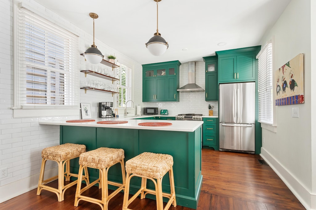 • 🍽️ Gourmet Kitchen: The modern, fully-equipped kitchen boasts high-end appliances, a peninsula with 4 bar stools, and a dining table seating up to 6. Perfect for culinary delights and shared meals.