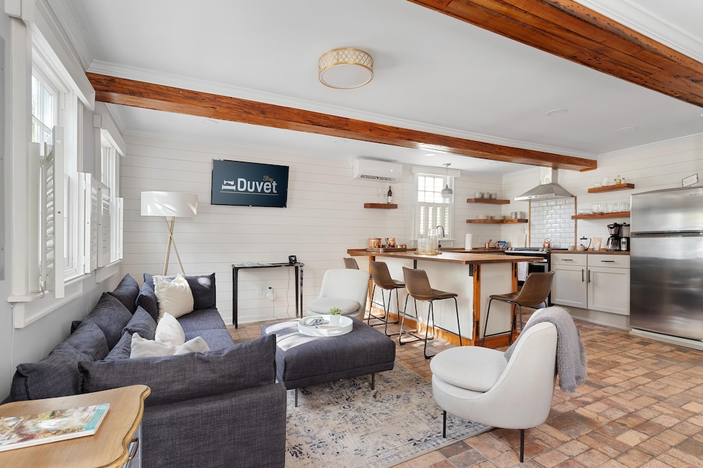 This first floor, main-level duplex unit has been completely upgraded! This open space has brand new furniture, kitchen appliances, classic brick flooring, all while throwing in a bit of historic Charleston with countertops, shelving, and ceiling beams all handcrafted from reclaimed heart pine wood that came from this very house dating back 170 years! The feeling of "fresh and mid-century modern" continue into the back half of the home, which consists of two bedrooms, a master and guest. Both bedrooms have new queen beds, linens, towels, and TV’s for you to relax after a day of power sightseeing. Each bedroom also has its own private bathroom, both of which are new construction.