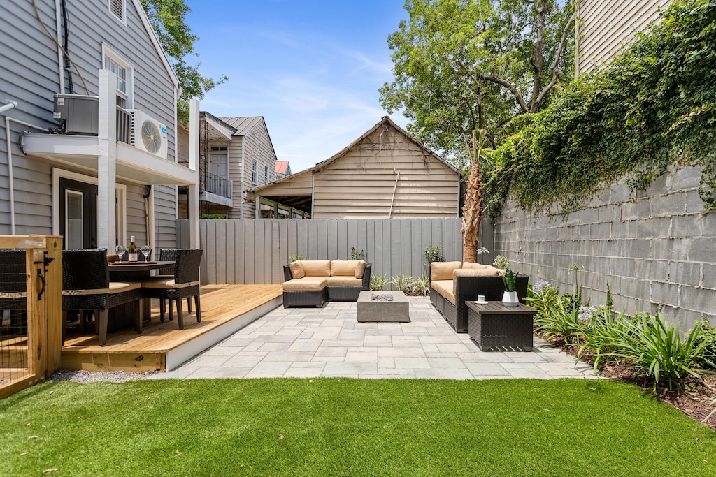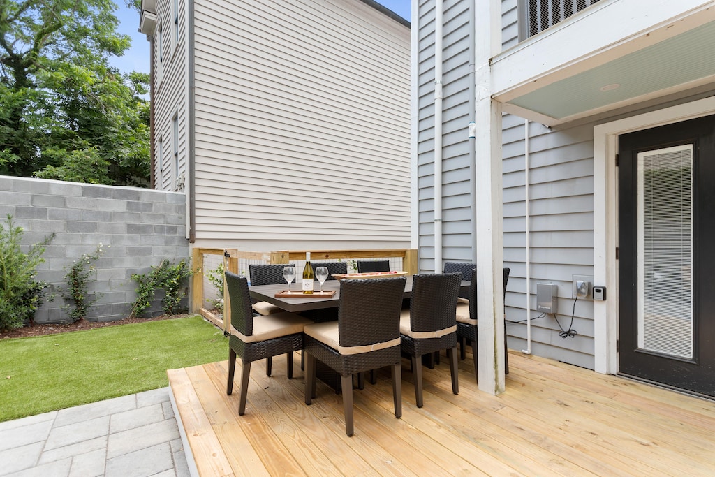 Set back off the busier streets of the Downtown Charleston area take a step into The Felix. With two bedrooms and two baths, this home is perfect for your four guests. Whether it be your small family or a girls weekend, this home is the perfect setting for your memorable Charleston getaway. As you walk through the doors find yourself in this airy home set back from the city happenings. The white backsplash of the wooden walls offsets the navy furniture giving way to the modern open floor plan from living room to kitchen. In the divide find the wooden bar with enough seats for the whole group. From the white wooden wall paneling to the white tiled backsplash in the kitchen, this home provides a welcoming bright layout to spend your afternoons relaxing after your walks along the battery and shopping adventures on King Street. The backyard is the perfect place to sit and unwind with a glass of wine or feel free to cozy up in one of the bedrooms with their Queen beds and smart TVS.