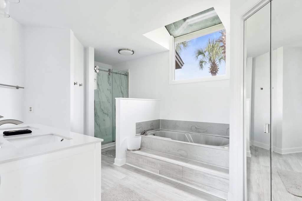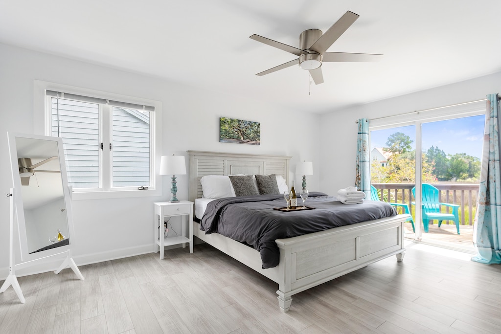 Each bedroom offers a comfortable retreat. The primary suite on the entry level includes a California king bed, porch access, and a spa style bath with a soaking tub and walk in shower. Additional bedrooms include two twins on the mid level and a king and queen on the top floor, all finished with quality linens. Multiple full bathrooms ensure convenience for everyone.