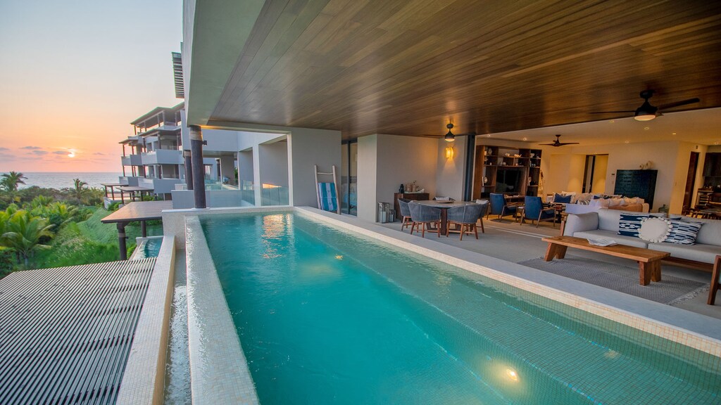 Enjoy this delightful Punta Mita condo with a private pool located within the renowned TAU Residences community. Here, earthy tones and a neutral palette allow the stunning ocean views to take center stage while the large pool terrace and lounge area provides a spacious setting for fun times with your favorite peeps.