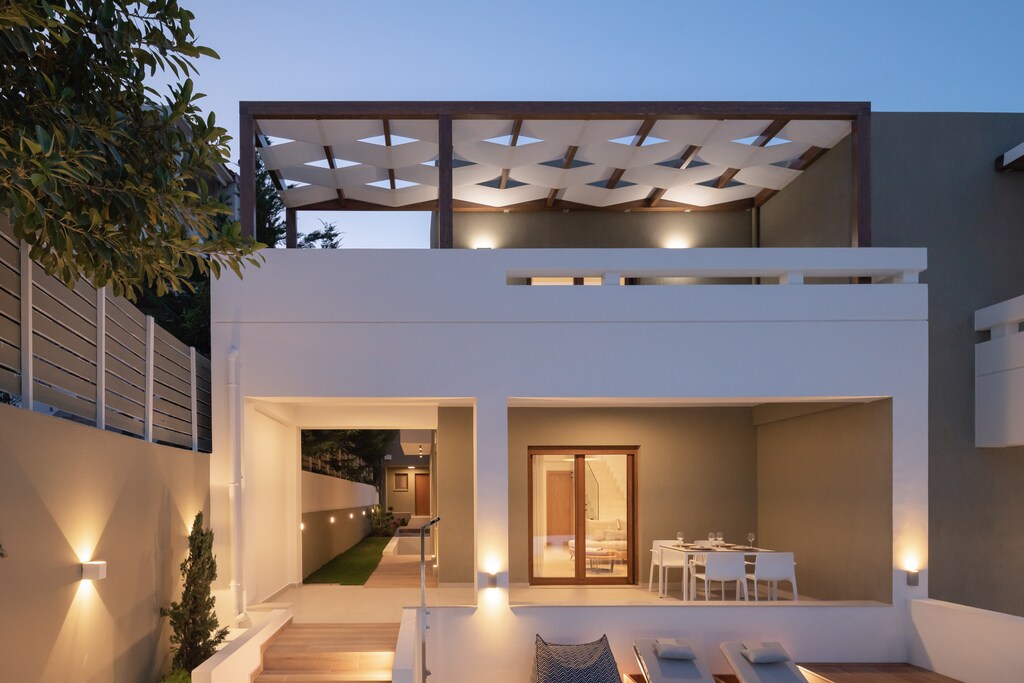 The spacious retreat spreads through three levels, making it an ideal escape for a small family or a group of friends. Lounge at the impeccable ground floor living room and watch the sunset lazily on the horizon before curling up on the sofa with a paperback. Set up a movie marathon at the 43’ Smart TV on long summer nights. A bespoke living-cum fully equipped kitchen awaits to inspire you for culinary wonders, with access to the terrace area and to an iconic dinning spot. The residence features two wonderful bedrooms with en- suite bathrooms on the first floor, two additional bathrooms lay also on the ground and lower floor, allowing plenty of space and comfort for all. It can comfortably accommodate up to 4 guests in real beds and an additional guest could sleep in the living room sofa bed.