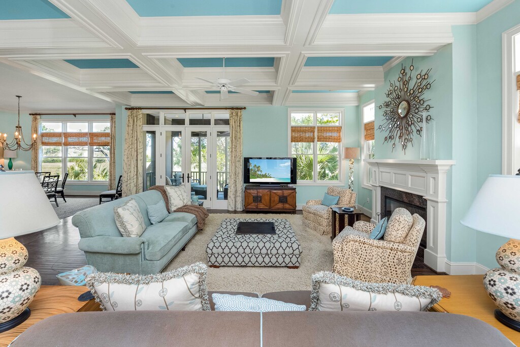 When you enter the home, you are welcomed by coffered ceilings, open living areas, and marsh views through the abundance of windows. An ideal place for gathering, the living room offers plenty of comfortable seating, a TV, and access to the screened porch. The dining area provides dining space for 8 with additional seating for 4 at the adjacent kitchen breakfast bar. The newly renovated kitchen boasts quartz countertops and backsplash, stainless steel appliances, and white custom cabinets.