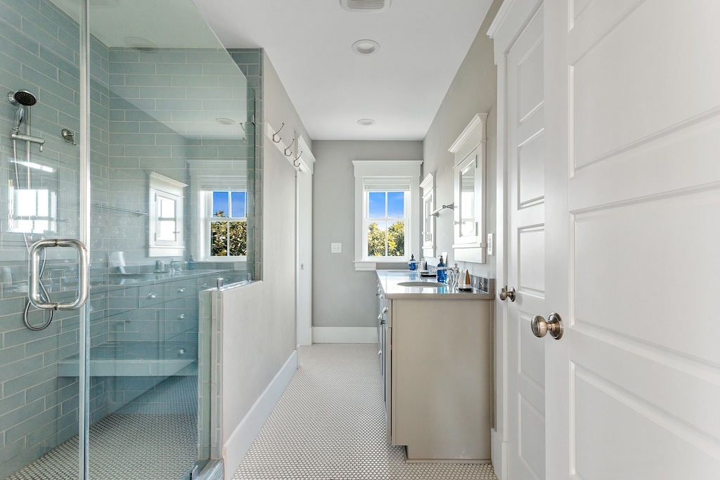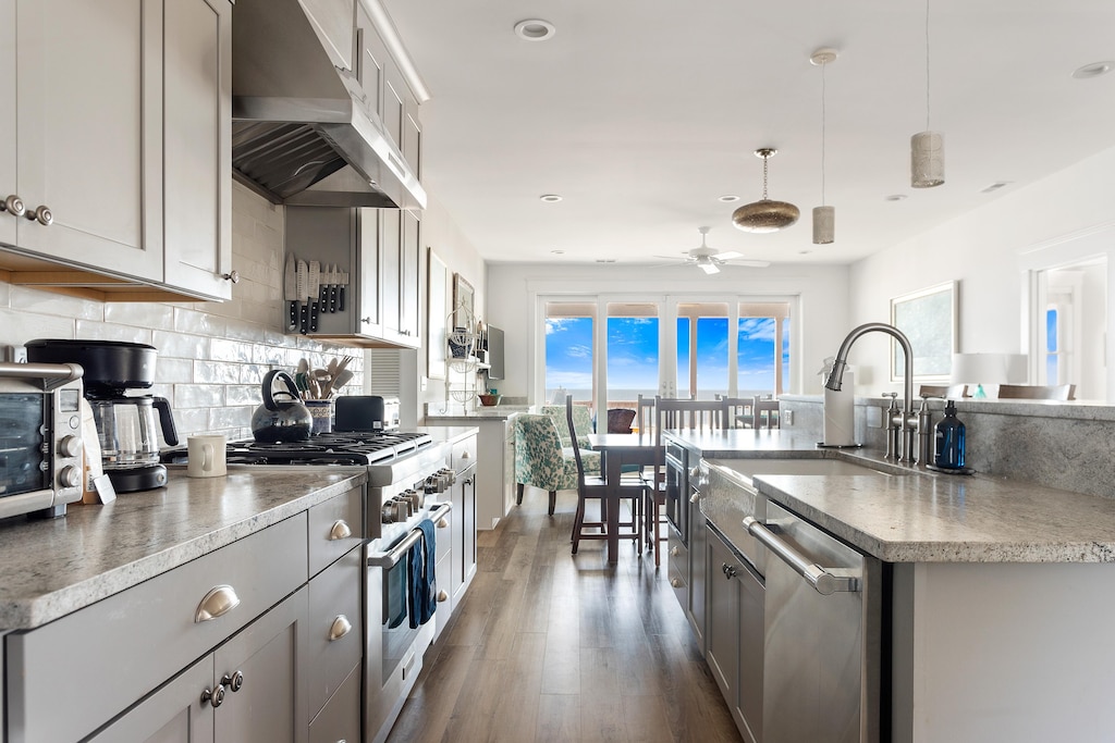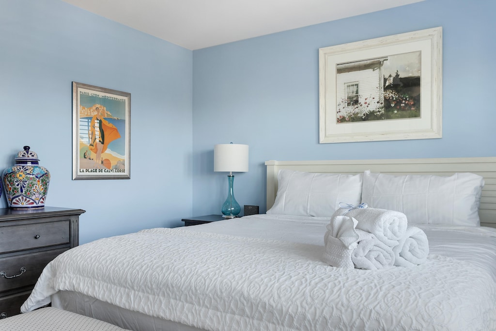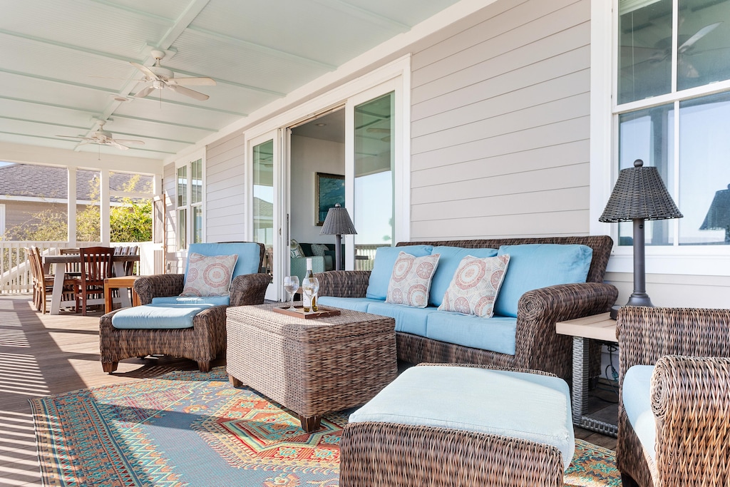 As you step through the front door you are welcomed by a well-equipped chef’s kitchen with professional-grade Thermador appliances, including a six-burner range and an open floor plan living space overlooking the ocean. The living space features a dining table that seats eight people as well as island seating for four. Here, you will also find a comfortable living room to lounge in with a 55’ smart TV with cable and streaming services. Enjoy the expansive screened-in porch with a plush patio set and a table that seats ten.