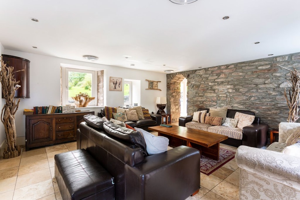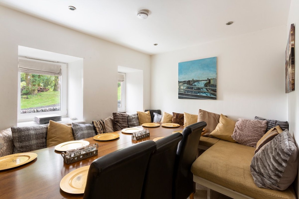 The Barn is a warm and welcoming property ideal for large get-togethers. A travertine marble floor runs throughout the ground floor and offers a stunning contrast to the original exposed stone walls in the kitchen and living area.An underfloor heating system from an environmentally sustainable ground source heat pump provides constant heating through both floors of the property. This house will accommodate 14 guests in total, with the maximum adult occupancy set at 12. A sofa bed in the play room can accommodate a further two guests.A river runs through the grounds. Facilities include a tennis court (this can be privatised for certain hours in the day). Two other properties are located within the estate but both are entirely independent so your group will have complete privacy. Guests staying at the barn also have access to a private sauna and hot tub for an additional fee.