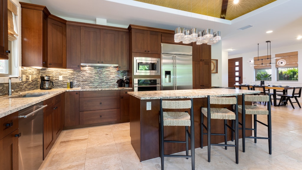 One of the greatest features of this home is the sliding glass wall of windows that open and slide away to open onto the lanai. The high-end grill is perfect for bringing home the fresh catch of the day or veggies from one of the many farmers markets.
