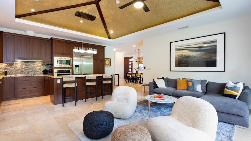 The house has a modern Polynesian design and a spacious, 1700 sq. ft, open floor plan with beautiful travertine floors throughout and a fully equipped gourmet kitchen, outfitted with granite counter tops and stainless steel appliances.