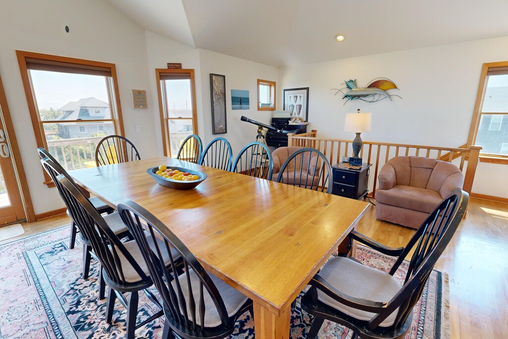 At mealtime, the kitchen’s amenities include a dual-temp wine refrigerator, a Kitchenaid mixer, a bread maker, a waffle maker, a rice steamer, a slow cooker, an espresso bar, and, most important, a Margaritaville drink maker. An oven with fast-heat for quick boiling can help hungry cooks whip up meals in a hurry, and everyone will have ample elbow room in the sunny dining area. The great room features a gas log fireplace, a 51-inch plasma TV equipped with a Bluetooth-ready soundbar, and a Celestron Astromaster 114-mm telescope for stargazing in the evenings.