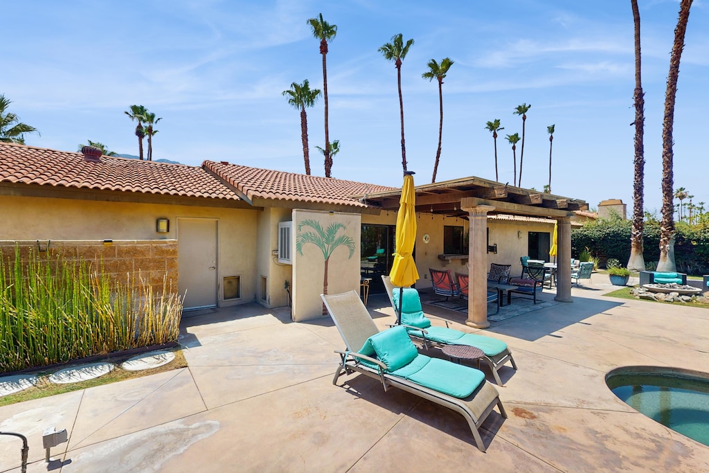 Gather up your friends and family and pack your sunscreen because this fabulous Palm Springs vacation home is the perfect getaway! Walk into this stylish modern interior and feel instantly at home. The living room is welcoming with comfortable modern furnishings, a 65’ flatscreen TV, and plenty of seating for all. Get together with friends and family for a home-cooked meal at the indoor dining table with seating for up to eight. Just want a quick breakfast? Easily done with bar seating for two at the breakfast bar. The kitchen is fully equipped with stainless steel appliances and everything you’ll need to prepare delicious meals and entertain guests. Head out to the lush backyard, completely surrounded by privacy hedges, and take a dip in the sparkling pebble-tec swimming pool with waterfall and bubbling hot spa. Great for relaxing with cocktails after a hard day of golf or shopping, you can float your cares away in the warm Palm Springs sun. There is also a fire pit, barbecue, covered patio, and plenty of seating, looking out to a lovely view West to Mt. San Jacinto.