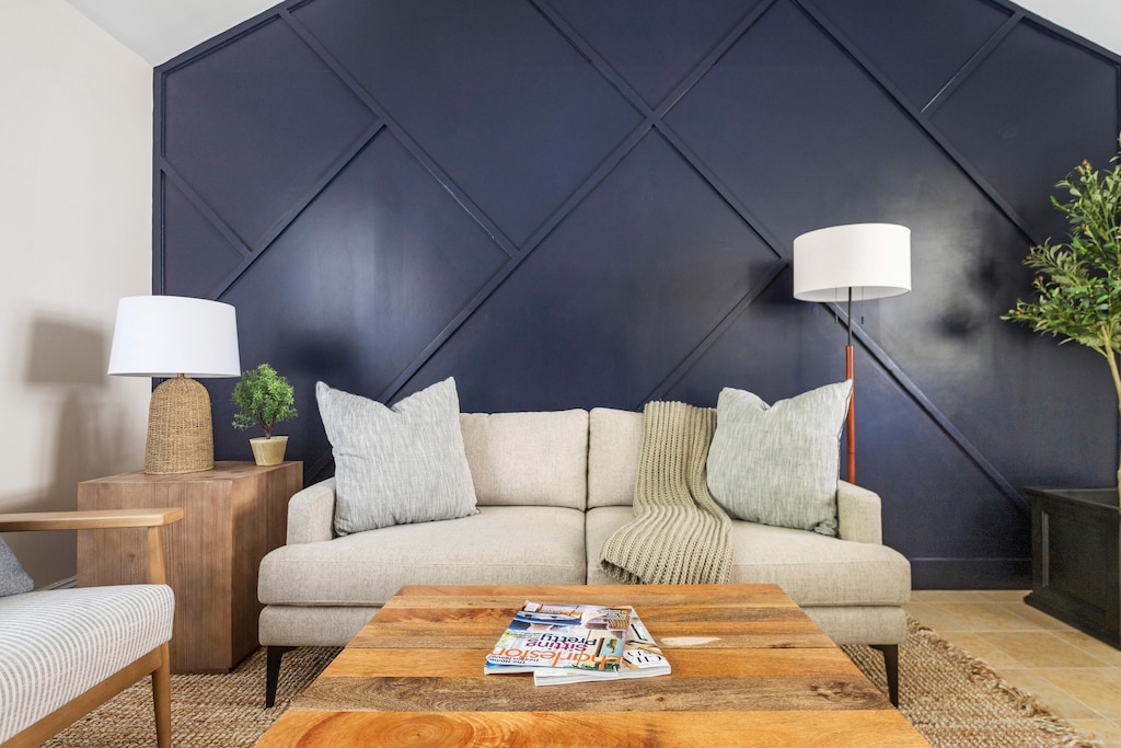 After a day exploring Charleston, relax in the comfortable living room with trendy furnishings and a flat-screen Smart TV. The primary bedroom offers a cozy queen bed, while the second bedroom features a twin-over-full bunk, perfect for families or friends. Both bedrooms include Smart TVs with live TV and streaming access. A washer and dryer combo adds extra convenience for longer stays.