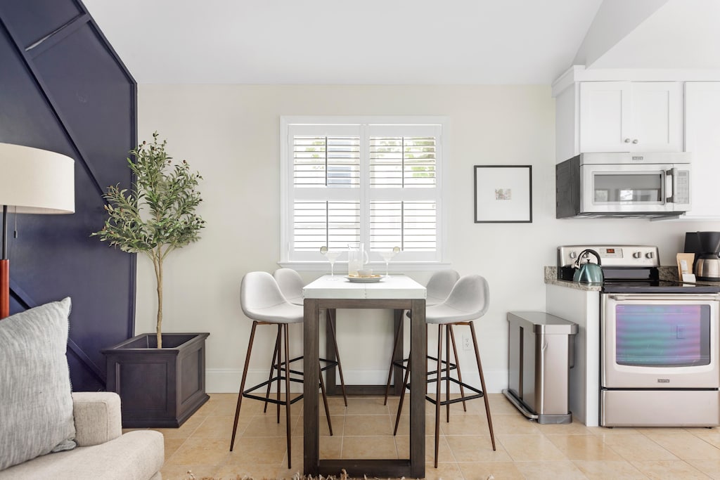 Boasting its own entrance, the Oswego Bungalow unveils an intimate yet comfortable floor plan that seamlessly blends dining and lounge spaces. An elevated dining table for four stands adjacent to our fully stocked kitchen, equipped with an electric stove top, oven, microwave, dishwasher, fridge, and all the essential cooking utensils to prepare a delightful feast. As a welcoming touch, we provide a bag of locally roasted coffee for your stay.