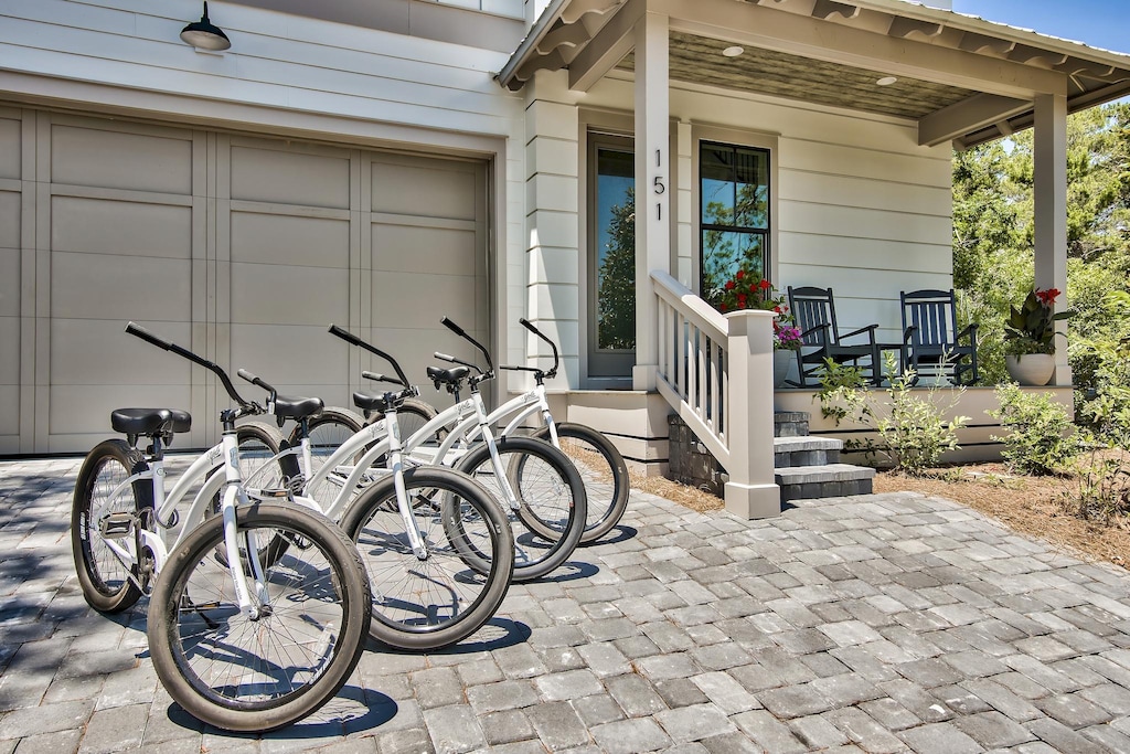 The home provides a brand-new, six-seater electric golf cart, plenty of beach gear (chairs, umbrellas, beach games, a beach wagon, etc.), a paddle board, towels (including beach towels), fresh linens, a pack-n-play, cutlery, iron and ironing board, cooking utensils, 2-car driveway, and large two-car garage. The garage hosts four brand-new premium beach cruisers and can house a golf cart if one is rented.