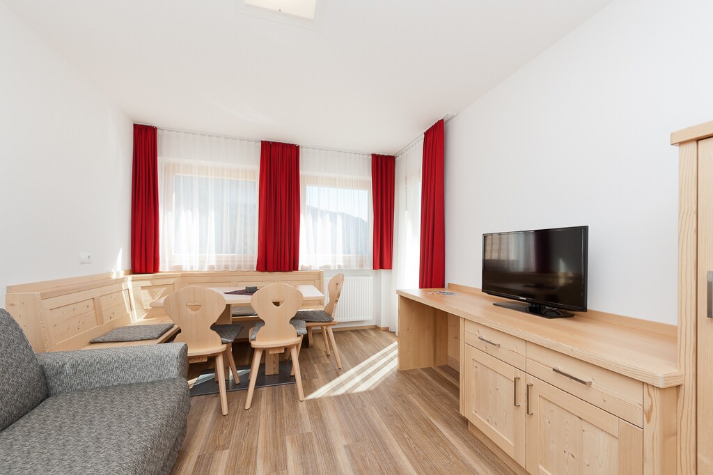 Apartment with balcony with view to the mountains or over the valley to the dolomites / living room / HD LED TV / fully equipped branded kitchen / one bedroom with king size bed / second bedroom with two single beds / bathroom with shower, WC and bidet / high-speed WIFI / 38-45 m² / 1-2 persons.