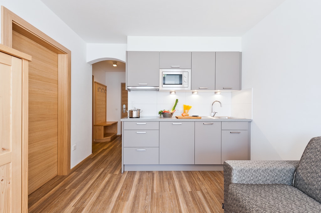 Apartment with balcony with view to the mountains or over the valley to the dolomites / living room with sofa bed / LED TV / fully equipped kitchen / one bedroom with king size bed / bathroom with shower, WC and bidet / WIFI / 32-38 m² / 1-2 people.