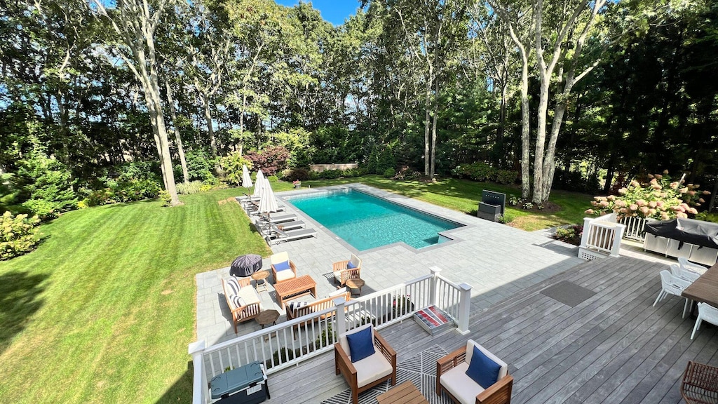 Timeless East Hampton retreat with amazing outdoor space, heated pool, wide sun deck, multiple lounge areas, balcony, firepit, gas grill and minutes to Hampton beaches and village