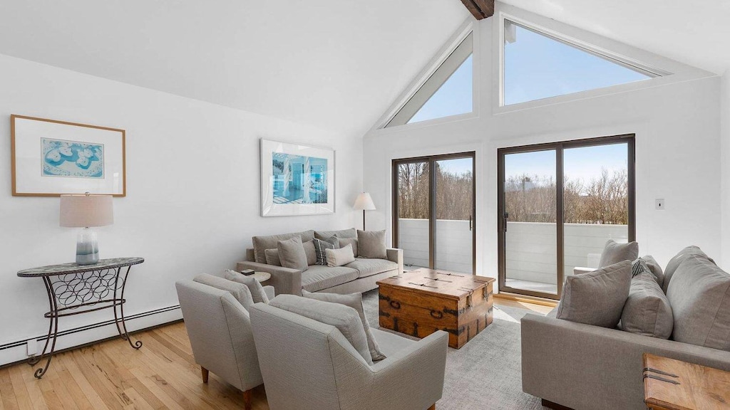 Escape to this pleasant Hamptons home with upside-down style architecture on a lush one-acre, conveniently located near all Bridgehampton has to offer and only a block from the beach! Trees and mature hedges surround the 2,500 square-foot home to ensure privacy and peace year-round. Windows in every living area allow natural light to brighten the airy interior. On the upper level, relax on the plush furniture in the great room with a vaulted, exposed beam ceiling and sliding doors through which you can access a balcony overlooking the expansive front yard. Whip up a hearty breakfast in the well-equipped kitchen with white cabinetry, and all the cookware you need to make delicious meals and small bites. Share a meal at the six-person table in the kitchen or at the six-person dining table adjacent to the furniture in the great room. On the lower level, guests can kick back in the den containing a sectional couch, flat-screen TV, an extra sink, and a fireplace for those chillier Hamptons days and nights. Through the den, guests can enter the spacious backyard with a deck, ideal for entertaining family and friends.