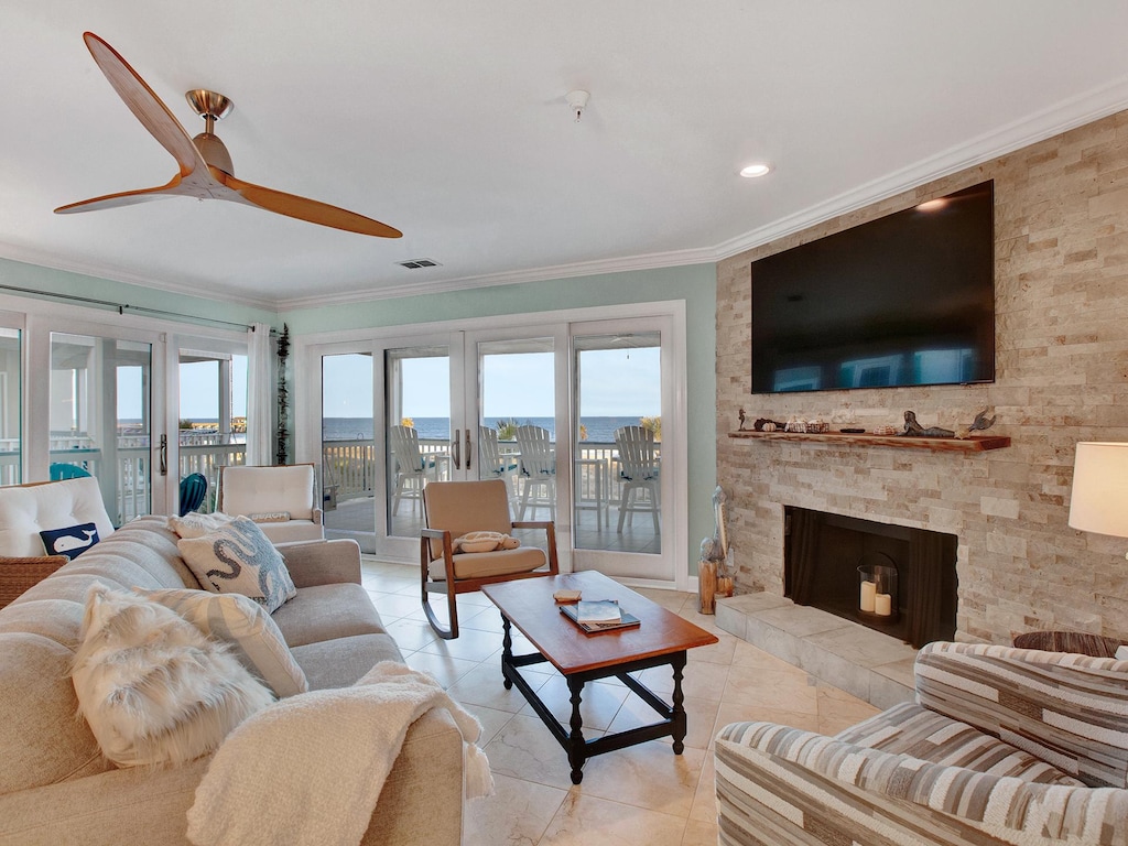 When you cross the threshold of your Tybee rental, a laid-back, beach-centered vibe draws you in with reflections of warm sand and blue waters. A contemporary open floor plan of the main living area conveys a sense of expanse with a beautiful ocean view as the focal point. The living room beckons with comfortable seating facing the flat-screen TV. Gather ’round for movie night or catch the weather report before you head out for daily adventures.