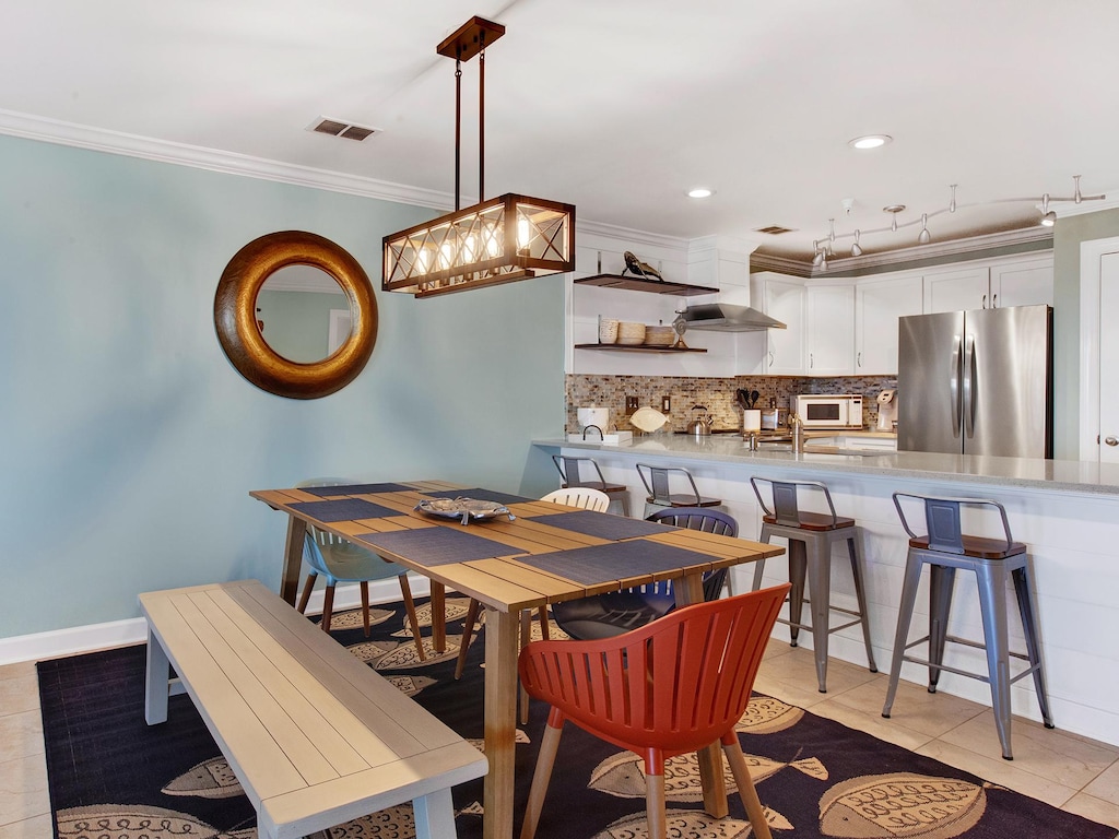 Back inside, the dining table just beyond the living area provides a gathering spot for meals or card games alike. Eye-catching art and a unique light fixture adds sea-themed appeal.