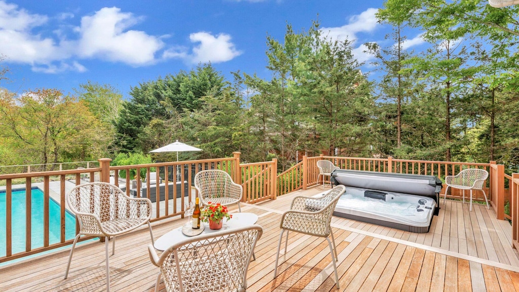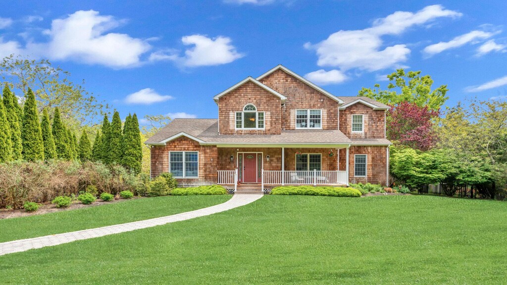 Quiet as kept, this quintessential Hamptons retreat with impeccable outdoor entertainment and beautiful landscaping sits on of the finest addresses in Westhampton. Thoughtfully curated with their guests in mind, this getaway exudes casual elegance, luxury comfort, and relaxation. Perfect for beach and nature lovers, spend your days with friends and family enjoying activities and amenities that fit any mood this summer. Greeted by rich landscaping, a commanding shingle-style exterior, and deep front porch, you are warmly invited to Westhampton Classic. From the sun-splashed main level, open the large glass doors to usher in fresh air, and effortless flow to the expansive rear deck. Featuring contemporary elements, rich hardwood floors, and sparkling white interior, the spacious living room makes for the perfect gathering place by a cozy fire. The gourmet kitchen is well-equipped for any culinary pursuit you desire as it features granite countertops, stainless steel appliances plus your main cooking essentials. Settled just off the kitchen, enjoy your prepared meals from the breakfast nook or the elegant formal dining room that seats up to six comfortably. Five serene bedrooms adorn this home including two large Primary suites with a large TV, walk-in closet, and luxe ensuite bath. Enjoy romantic bubble baths from the deep soaking tub available. The three remaining bedrooms also offer large TVs, closets, and ensuite baths. Soak up the sun from your private backyard oasis whether you’re starting the day or ending your day. Ideal for full-scale entertaining, there are multiple seating areas for relaxing in the shade, dining alfresco on the wraparound deck, or taking a swim in your oversized, heated pool. There is also a fire pit for cooler evenings under the stars. When you’re ready to explore south of the highway, take joy in your proximity to everything including pristine ocean beaches and local shops and restaurants. True Hampton living at its finest!
