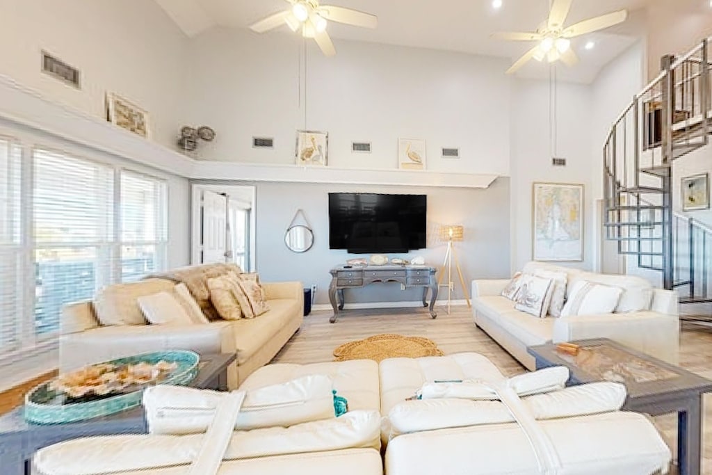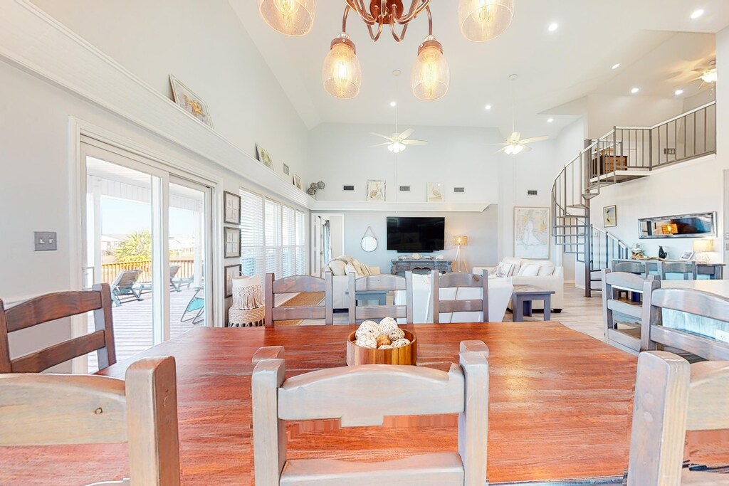 When it’s time to unwind after a day of exploring, the living room offers comfy couches and chaises you’ll fight over, and a flatscreen TV for all your entertainment needs. Bedtime means your choice of four comfortable rooms, the main suite with a king and three with queens, but the kids are going to love the loft, with four matching twin beds lined up in a row. Before bed, step back out onto the deck and slide onto one of those barstools to toast your good luck at finding this perfect island getaway – all you need now is a butler to bring you a drink.