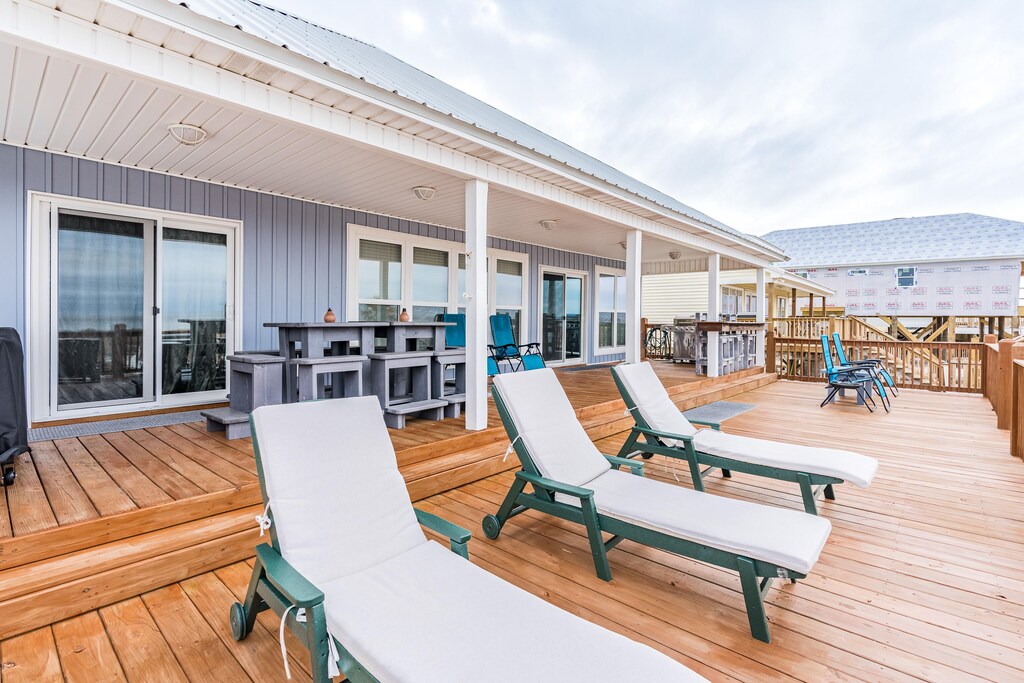 This pretty as a postcard waterfront home on Dauphin Island offers all the room you need to spread out while still enjoying together time. The best place to bookend the day is the large deck, which offers rocking chairs for morning coffee, and four barstools plus a bar with a view for evening sundowners. With several tables perfect for alfresco dining and a gas grill, you’ll probably spend most of your time outside, but inside is just as welcoming.