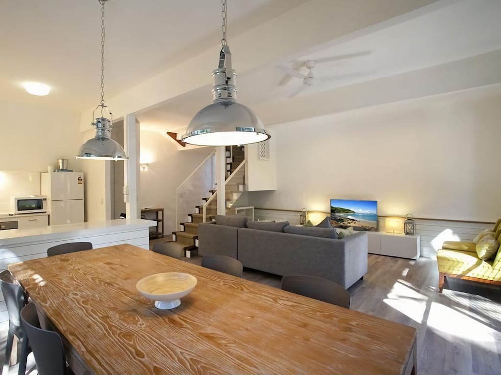 The Unit - This two-storey townhouse has 3 bedrooms and two bathrooms. Entering the unit, you are greeted to an open living area consisting of a dining area, lounge area with air conditioning, ceiling fan, 42 inch LCD HD TV, DvD player with selection of family and children’s DVDs provided for guest use. The Kitchen with stone bench top is well-equipped with appliances including oven, cook top and dishwasher and Nescafe Dolce Gusto coffee machine (BYO pods).