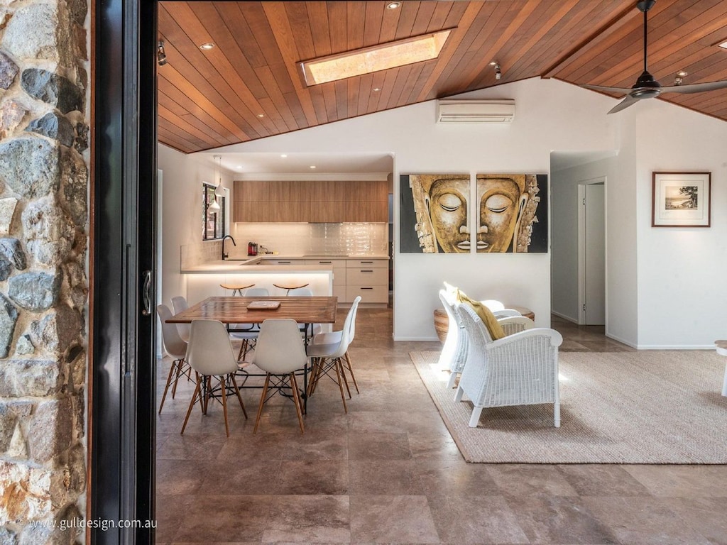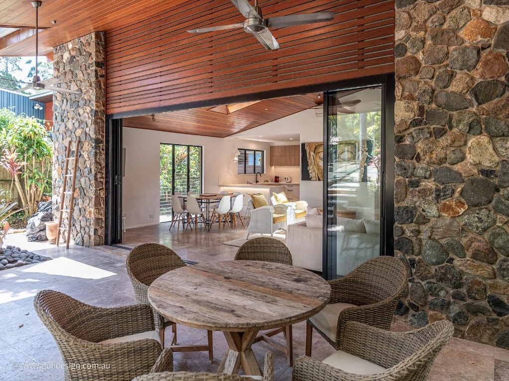 A modern multi-level Little Cove Noosa home with all you could need for a great holiday! Furbished house with beautiful timber ceiling feature with skylights and glass louvres throughout for maximum ventilation has 4 large bedrooms (1 King, 2 Queen, 2 Singles) with built in robes and 3 bathrooms including an indulgent master ensuite . Recycled spotted gum and earthy travertine tiles throughout.