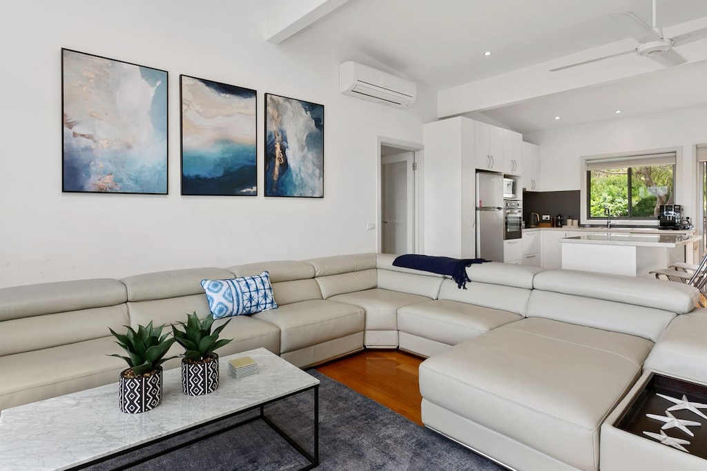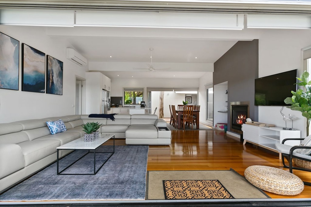 A three-bedroom home with spectacular ocean and hill views captured from open plan living area plus the two main bedrooms. The front deck runs along the length of the house giving you ample outdoor living and spectacular views. Living area features a large modern gas log fire and an 8-seater dining table. Complimenting the timber flooring, the double-glazed sliding doors open to an expansive north-facing timber entertaining. The garage has also been converted into a second spacious lounge rumpus area with a TV, sofa bed and lounge chairs, backing onto the deck the garage door can be opened to provide even more entertainment space. The property also has an electronic vehicle charger.