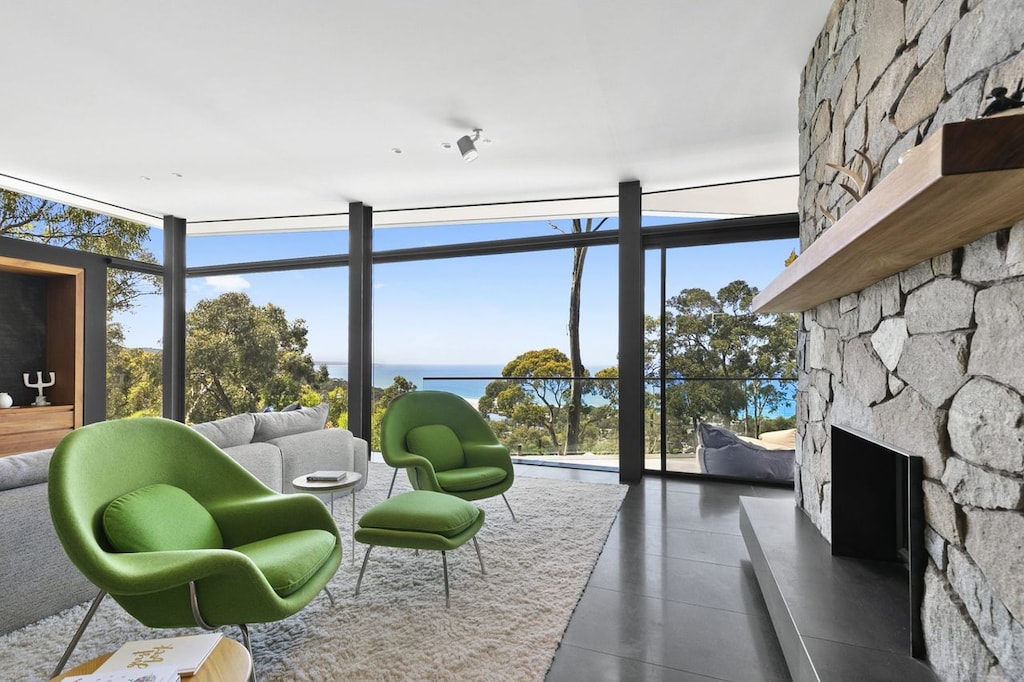 Perched high within a prestigious, covetable enclave, the home enjoys the privacy and quietness of bush surrounds. Yet it is only one minute drive or an 8 minute walk from Lornes main cafe and shopping strips. Expanses of floor to ceiling windows offer glorious views of Louttit Bay, the Erskine River estuary and the surrounding trees this is truly where the Otways meet the Southern Ocean.