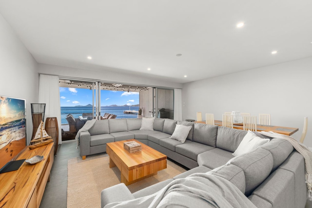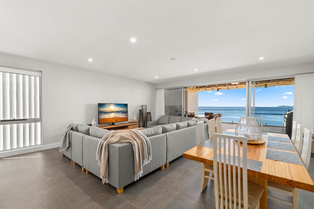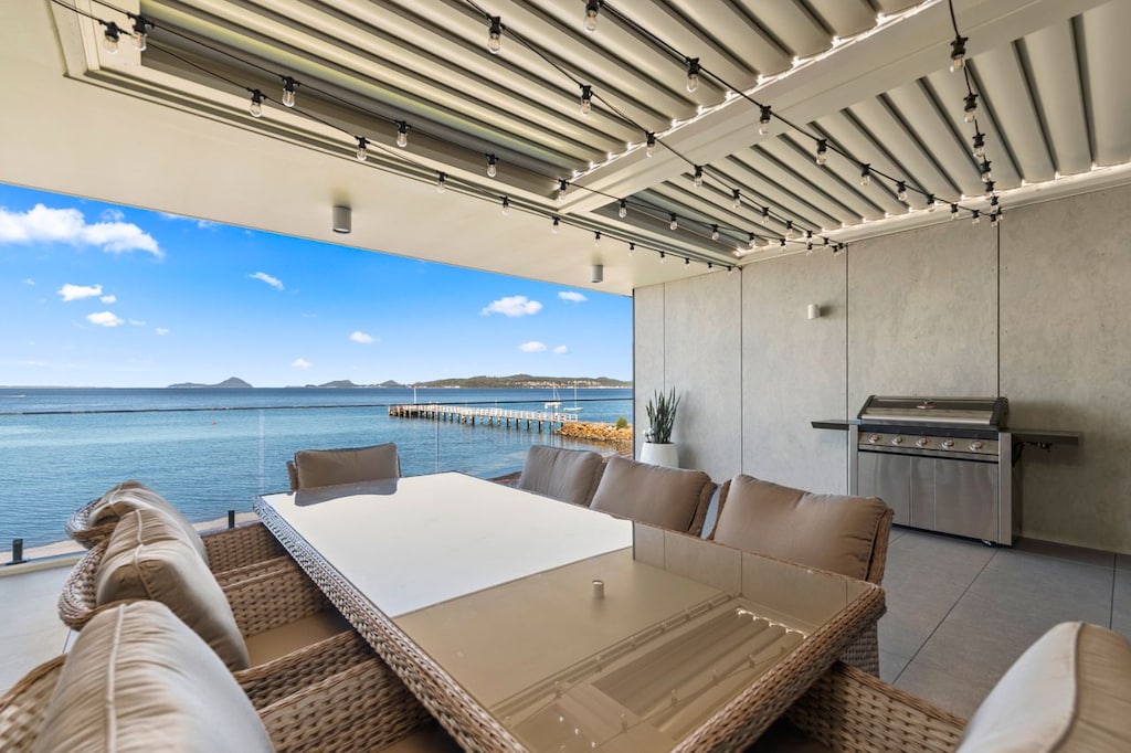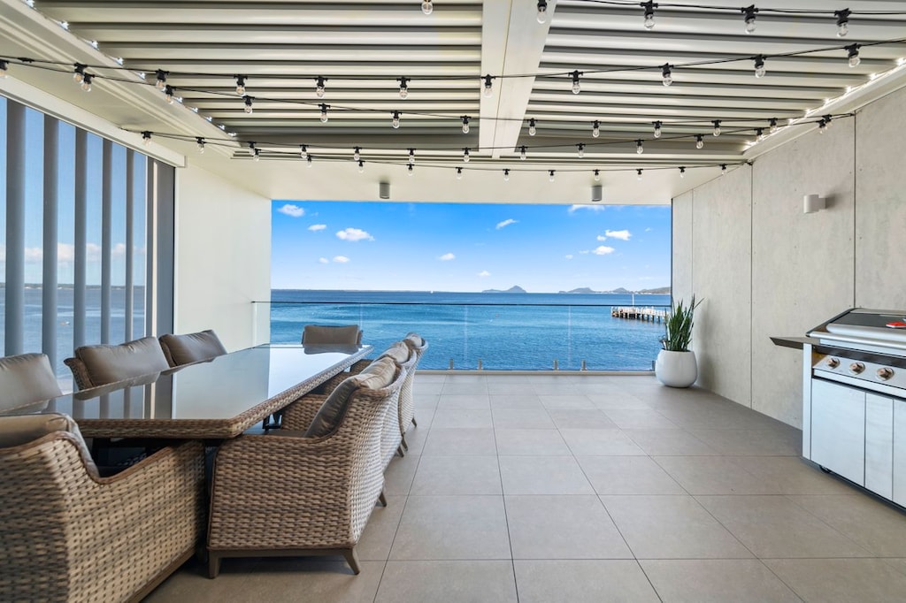This brand new, absolute waterfront apartment boasts a huge, covered entertaining balcony with panoramic views out over the water. Greet each day with a hot coffee as you watch the sunrise over the ocean and later, after a day out adventuring, cook up a BBQ and sit back with some cool drinks in the fresh sea breeze.