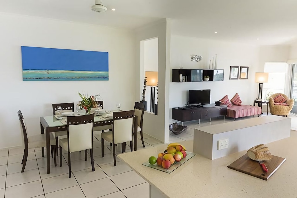 There is free Wi-Fi, but not suitable for ’working holidays’. There is no air-con but ceiling fans in each room. There are full laundry facilities in the apartment and the garage is for one car only & is NOT suitable for vans or 4WD vehicles due to a canoe permanently stored in the roof area. There is also 3 x visitor carparks onsite.