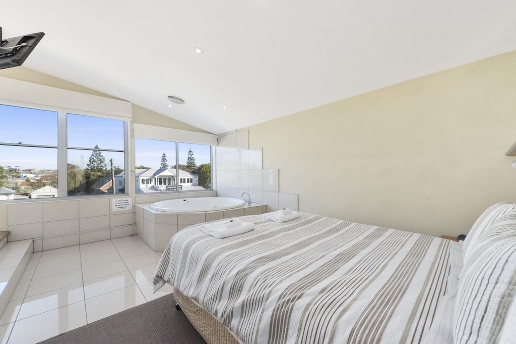The 1st level offers bedroom 1 with queen bed, doona, pillows, 2 x reading lamps and an electric wall heater. Bedroom 2 offers 2 double bunks (1 with trundle), doonas, pillows, electric wall mounted heater and a wall mounted smart TV. There is a large well appointed, modern bathroom located adjacent to the bedrooms containing bath, separate shower, toilet & vanity. The 2nd level comprises bedroom 3 with a queen bed, doona, pillows, reading lamps and fully appointed en suite. The toilet/powder room is also located separately to the bathroom area. The bedroom also features a large round spa with a wall mounted TV, where you can sit back and relax and enjoy the bubbles with a glass of wine.