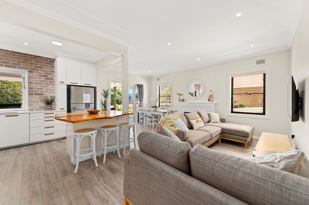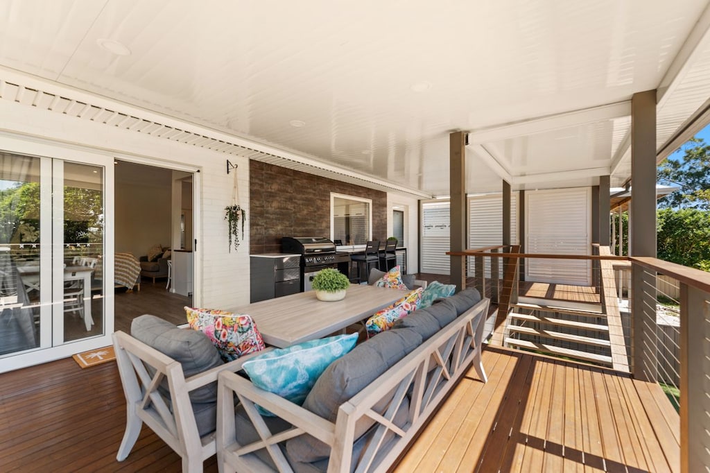 A property that literally ticks all of the boxes, 5 Moorooba Crescent combines location with accessibility, and even welcomes your small dog ,although yard is not fully secure but the real show stopper is its unbeatable entertaining space and luxurious feel. With its high ceilings, beautiful modern furnishings and fittings, spacious, open plan layout and ample living spaces, this home is a true entertainers delight. The living and dining area has a cosy gas fireplace and big screen TV, plus Wifi, and opens right out to the sensational, covered entertaining deck which overlooks the garden and is elevated to catch the coastal breeze. After a day out exploring, relax out in the alfresco on the comfortable furniture with a BBQ dinner and a cool drink from the wine fridge. The stylish kitchen even has a convenient hopper window to the deck to make entertaining a breeze.