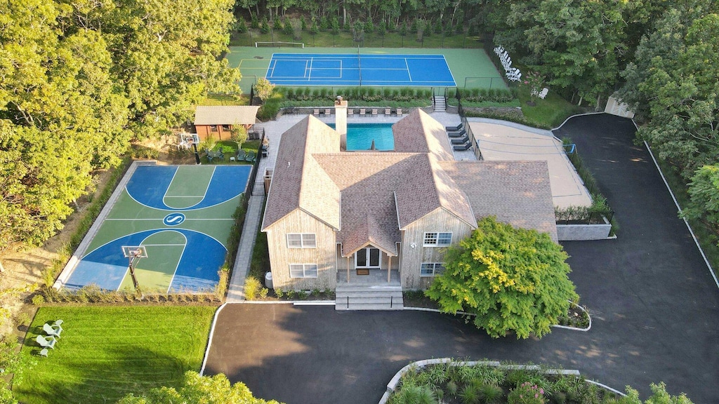 Tennis Court (Private), Basketball Court, Deck/Patio (Uncovered), Lounge Chairs (6 Chairs), Patio Furniture (Table, Chairs), Grill (Gas), Outdoor Shower (Hot + Cold Water), Tennis Equipment (Rackets, Balls), Balcony, Fence Around The Yard, Private Pool (Outdoor, Heated)