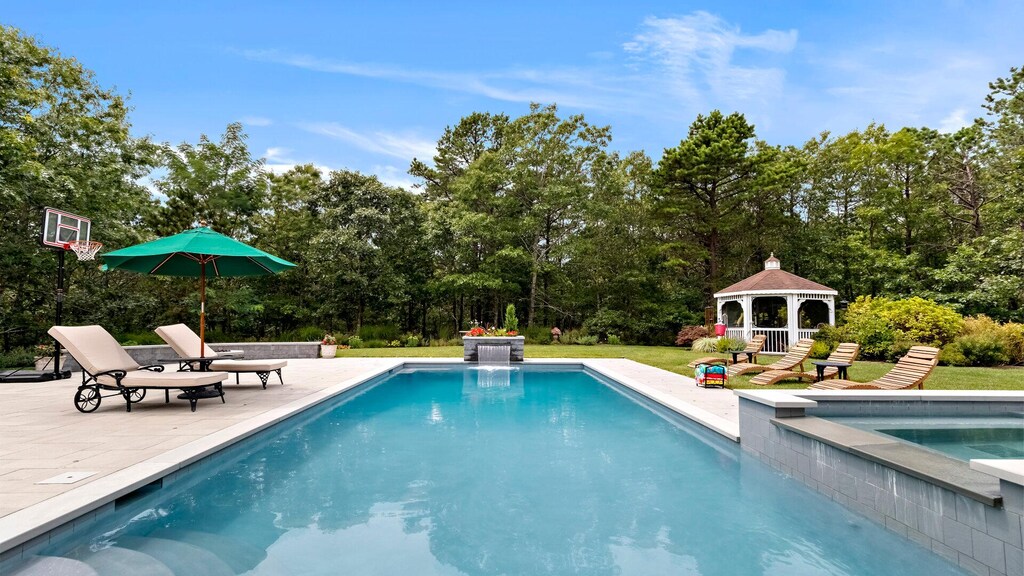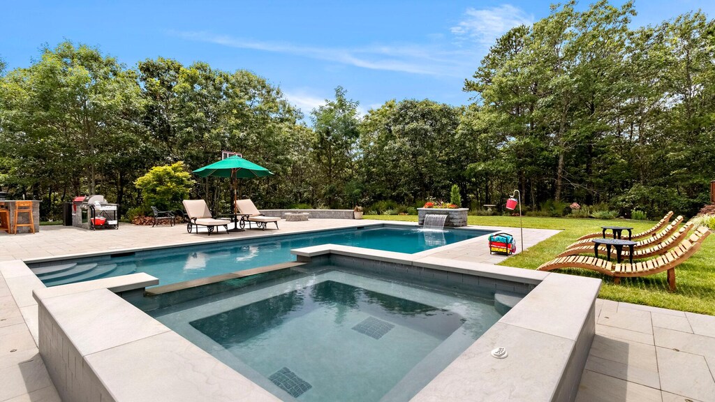 Entertain and unwind with family and friends in the massive, private backyard. Fire up burgers, brats, and veggies on the charcoal and gas grills in the small outdoor kitchen area, and enjoy on the bar accommodating six or on the patio furniture. Take a refreshing dip and float the day away in the large heated saltwater pool. Soak up the sun with a cold drink poolside on the eight lounge chairs. During the evenings, decompress in the adjoining 8-person spa under the stars. The immaculate lawn provides ample space to run around and play the many outdoor games provided. When you are ready to explore, take a scenic ride around the area on the four bikes, including two for adults and two for children. You are also a short drive away from spectacular Hamptons beaches. End the night with Smores around the gas fire pit. Drift off to sleep in the four spacious, colorful bedrooms, each with a TV and a full ensuite bathroom. The master suite boasts vaulted ceilings, a two-sided fireplace, and a 70" soaking tub. Exquisite in East Quogue offers an unforgettable getaway you will never forget.