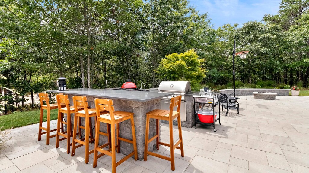 Deck/Patio (Uncovered), Lounge Chairs (8 Chairs), Patio Furniture (Table, Chairs, Umbrella), Grill (Gas, Charcoal), Fire Pit (Gas), Basketball Court, Bicycle (2 Adult Bikes, 2 Children Bikes), Fence Around The Yard, Beach Chairs (2 Chairs), Private Pool (Outdoor, Heated, Saltwater), Hot Tub