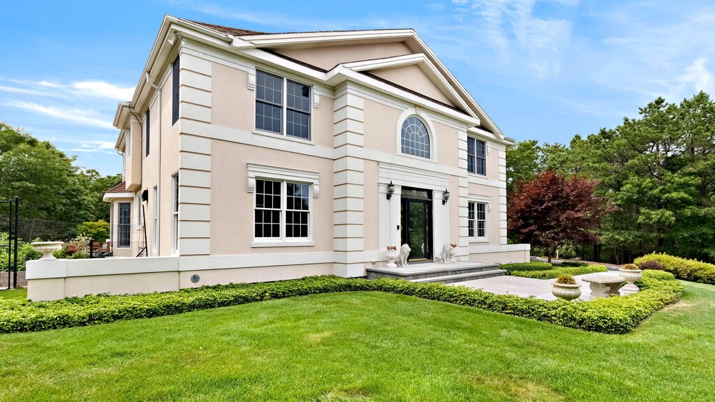 Tucked away on a secluded hilltop in the Hamptons, this post-modern residence on over one-and-a-half acres offers luxurious indoor-outdoor living in East Quogue. Gardens with ornamental trees, evergreens, flowers, and well-manicured landscaping surround the home. The impressive, open 3,800-square-foot interior features grand living spaces with top-of-the-line amenities and furnishings, with an additional 1000-square-foot finished basement. Natural light fills the airy space, illuminating the pristine hardwood flooring and crisp white walls. Relax in the two-story great room with sliding glass doors leading out to the back, plush blue furniture, a cozy fireplace, and a flat-screen TV. Whip up a hearty brunch in the spacious kitchen equipped with stainless steel appliances, granite countertops, and blue cabinetry. Sip a cup of home-brewed coffee made in the Keurig and read the morning paper at the counter area with six bar stools. Share a meal at the casual dining table next to the kitchen or in the formal dining room containing an eight-person table. The office-library is equipped with computer monitor, keyboard and printer, and separate TV for those needing to connect to work. During the evening, the library converts into a 1920s style saloon for entertaining with a connecting bar area, a four-person high table and wine fridge. In the finished basement with hardwood floors, watch a movie or the game in the theatre corner equipped with 85" screens and surround sound, or play a friendly game of pool, ping-pong, and foosball. You can also shoot hoops on the basketball net in the backyard. Work up a sweat before your day begins in the basement fitness area featuring a treadmill, stationary bike, weight training equipment, and a yoga mat to do a self-directed yoga class. In the music corner, strum up a tune with the guitar or keyboard. Play pleasant background music throughout the day using the Sonos speaker system.