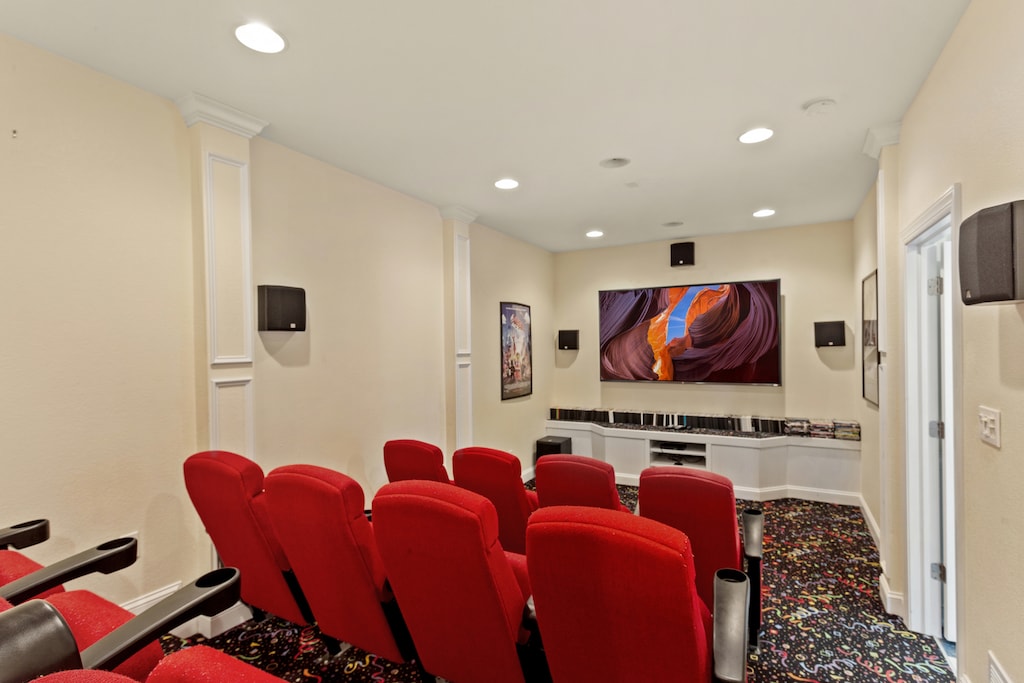 The ground level of this home has plenty of parking in the driveway for your family group. Out back is where the fun begins! Grab a cold beverage and hang out at the tiki bar. Your family will love splashing around in the large fenced-in private pool or relaxing in the bubbly hot tub. After a long day at the beach, rinse off in the outdoor shower. The fun doesn’t stop once you step inside. In fact - it’s just getting started as you enter the game room! Get a little family-friendly competition going when you shoot some pool at the pool table or test your skill level at foosball. A convenient wet bar and full-sized fridge are nearby - perfect for storing cold beverages. When you’re ready to watch a movie, pop some popcorn in the downstairs microwave and step into the theater room, featuring a 100-inch projection screen and stadium seating with cup holders!