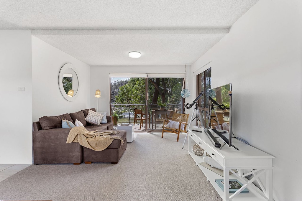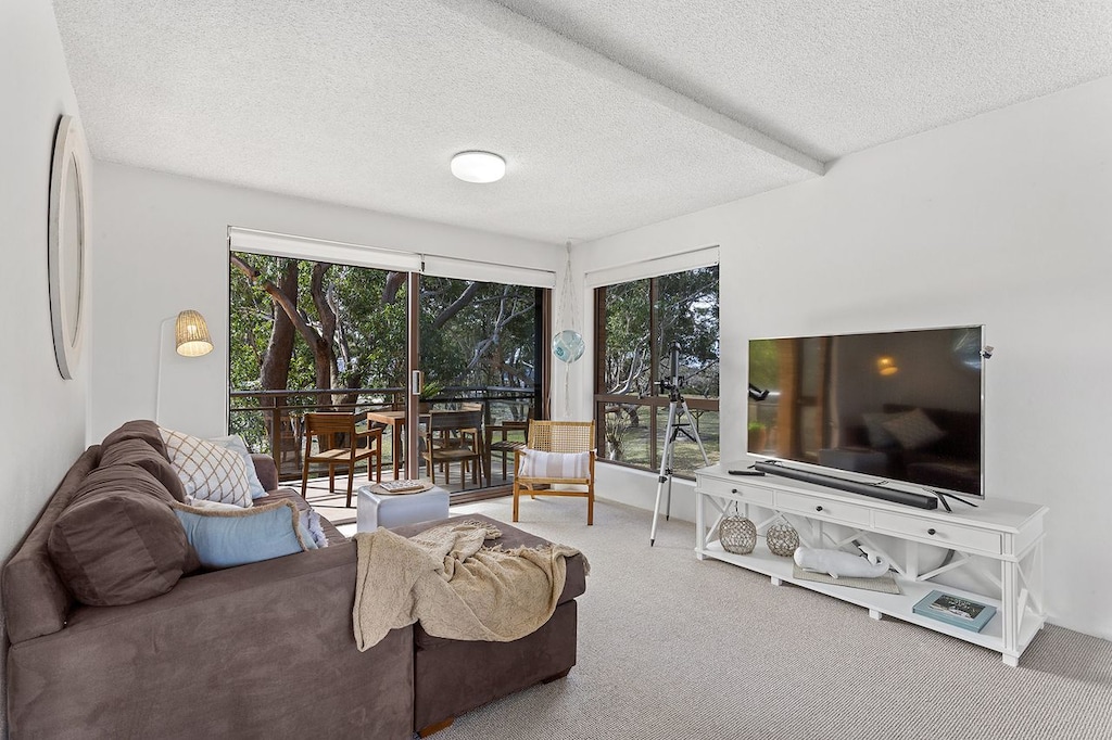 The Unit- This appealing second floor apartment, recently refurnished and styled, has a coastal theme and it is ready to enjoy. The apartments northerly aspect with two opposing balconies ensure the lounge and dining areas are filled with natural light and catch the cross-breezes which can provide natural and ‘eco-friendly’ air-cooling in summer. There is air-conditioning for the really hot days. Filtered water views to both beaches are seen from the north balcony giving an island feel. Entering the apartment, you are welcomed into an open plan living area consisting of dining area and a comfortable lounge area with a 58cm smart TV, a sound bar (with Bluetooth connectivity) and unlimited Wi-Fi. There is an attractive well-equipped kitchen with a breakfast bar with stools and equipped with a microwave oven, full-sized fridge freezer, oven and stove top, coffee machine and dishwasher. The two balconies offer outdoor furnishings and a gas (Weber style) BBQ for you to dine al fresco whilst enjoying the views over the bushland and bays. There is reverse cycle air-conditioning to provide heating in the cooler months.