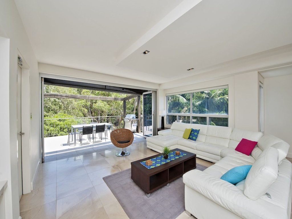 The Apartment - Stylishly appointed throughout, this three bedroom air conditioned apartment provides easy indoor/outdoor living with bi-fold doors that open the main living area to the spacious deck, which overlooks bushland reserve offering an outdoor setting, gas BBQ and filtered water views to the headlands. The tiled living area offers a lovely leather corner lounge, large flat screen TV, DVD player, i-pod dock, split system air conditioner (heating + cooling) and WiFi. The modern kitchen comes with stainless steel appliances including a double door fridge/freezer, microwave, dishwasher, oven, glass stove-top and plenty of bench space to prepare meals or platters.