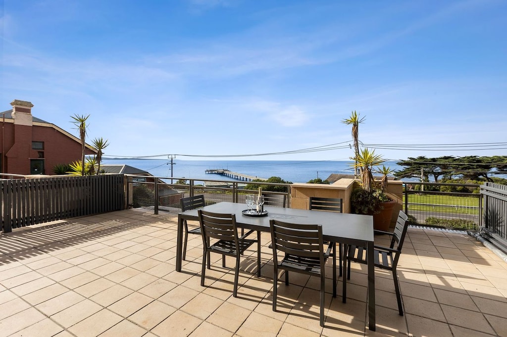 On entering the spacious tastefully furnished living room you feel like you are standing on top of the ocean. Breath taking 180-degree views from the large, elevated balcony immediately take you on a visual journey from, Airey’s Inlet Light house, through Louttit Bay back to the pier and out to the open sea. A BBQ and large outdoor setting mean you can spend all the time you want enjoying the serenity You only need to step across the road to a secluded beach, a perfect fishing perch on the Lorne pier or the infamous Aquatic Club and Lorne Pier Seafood Restaurant.