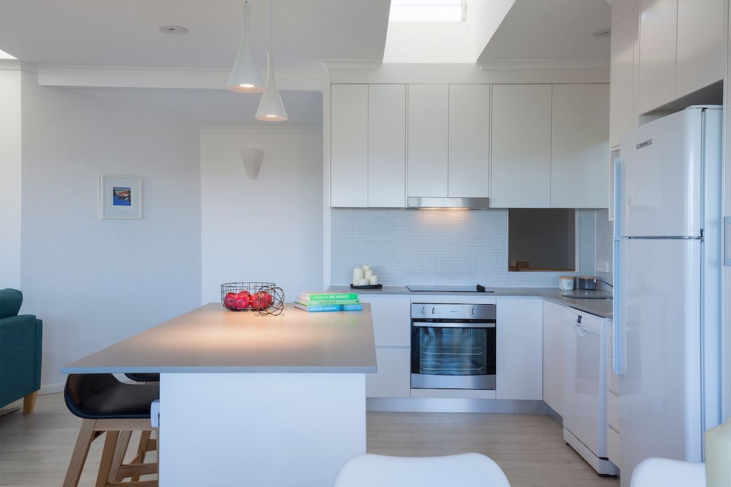 The newly refurbished, fully equipped, galley style kitchen features an electric stovetop, oven, dishwasher, Nespresso coffee machine and breakfast bar.