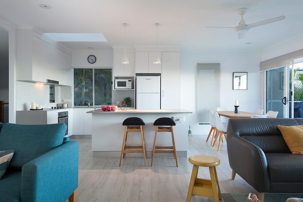 Villa Pandanus Peregian Beach is a sunny, generous sized beachside townhouse that offers a fantastic option for families who are looking for a great location, with the access to the beach just around the corner. The fully fenced private backyard is dog friendly and the deck on the lounge offers ocean glimpse and sea breezes.