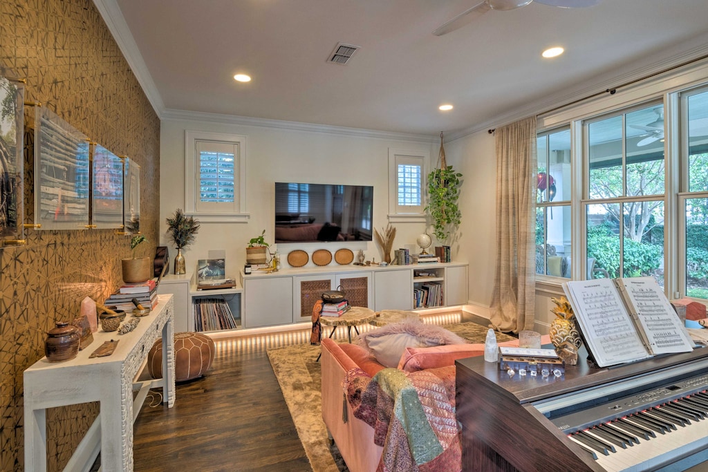 INDOOR LIVING: 3 flat-screen Smart TVs w/ Netflix, piano, hardwood floors, modern decor, dining table, library