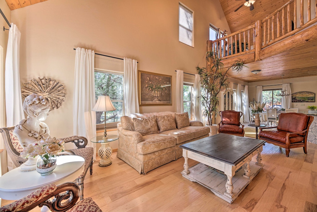All-season adventure and easy access to local attractions await your stay at this 4-bedroom, 2.5-bath hideaway. Hosting a 2-level interior with thoughtful decor, a cabin-style atmosphere, and modern amenities, this vacation rental serves as an ideal home base for relaxing and sharing quality time in the Mogollon Rim area woods. After a day in town or on the trails, enjoy the peace and quiet of the outdoors with a BBQ on the back deck or take a beverage of choice and unwind on the front porch.